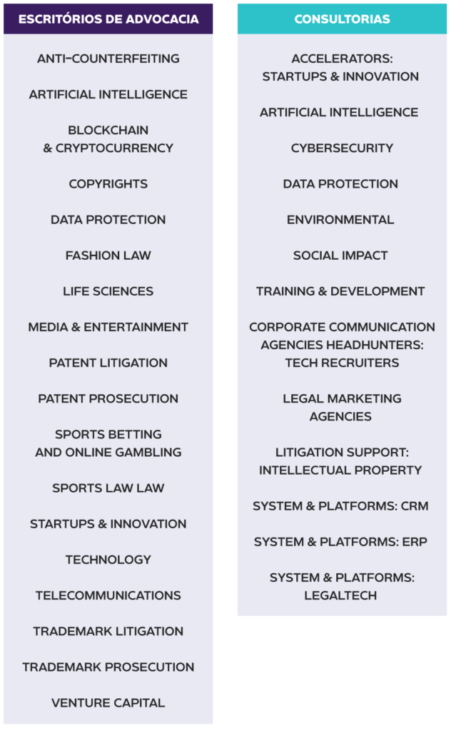 Já o Leaders League, na categoria Innovation, nomeia escritórios com práticas em áreas ligadas à tecnologia como Data Privacy, Cybersecurity, Online Gaming, além de agências de marketing, consultorias em tecnologia, empresas com soluções digitais, iniciativas em ESG e meio ambiente, entre outras frentes que integram tecnologia, governança e impacto.